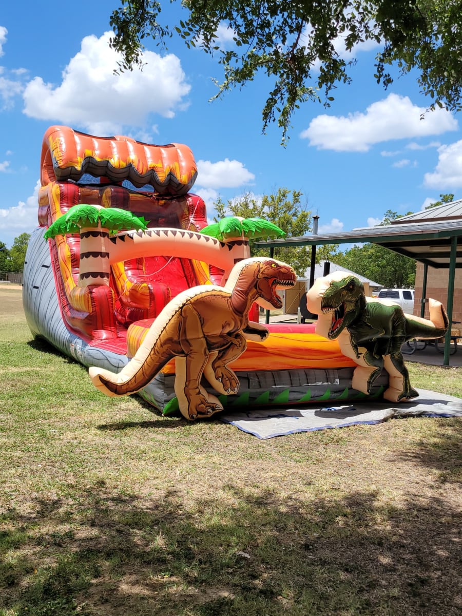 This slide can be used dry or for waterslide use with a giant pool, perfect way to cool down and beat the summer heat. Both options will still allow for a phenomenal time. With two dinosaurs attached to the front of the slide it is perfect for any jurassic, dinosaur, tropical or jungle themed party. With this slide you can have the best of both worlds because adults can join in on the fun as well. Yes that's right adults can get on this waterslide.Children do need to be supervised to ensure a fun, but safe time.