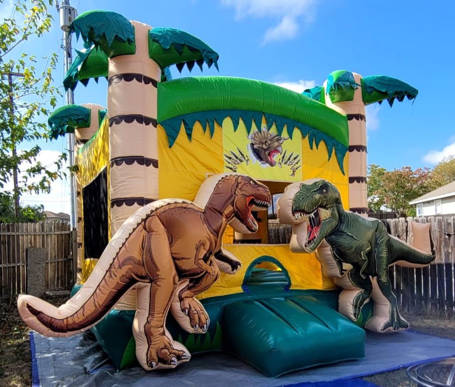 This Dinosaur bouncehouse is perfect for any jurassic, dinosaur, jungle or tropical themed birthday party or event. This castle has two giant, realistic 3D dinosaurs attached to the outside of the castle that will stand out at any party. This bouncehouse is also a 2 in 1 bouncehouse that has a added basketball hoop inside that allows for even more fun.