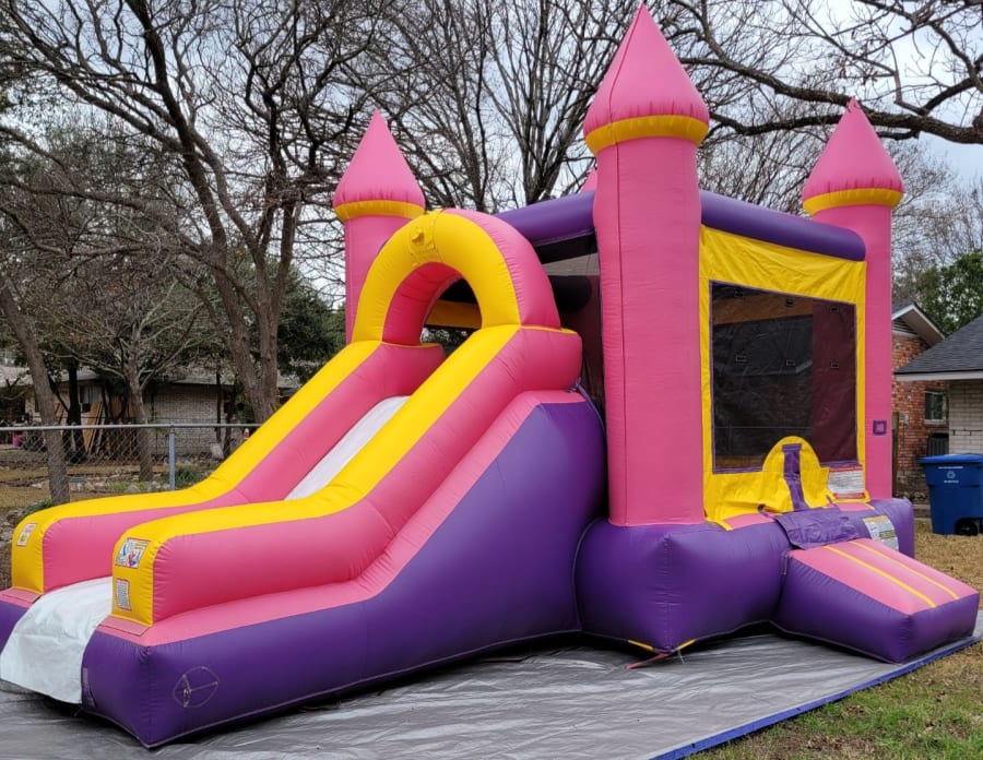 This bouncehouse combo with slide attached is full of bright pink and yellow princess colors which makes it perfect for any princess party. The slide attached allows for the little ones to have extra fun! Let this pink bouncy house be the highlight of your little ones patty. It is guaranteed to bring smiles to all the children's faces especially the birthday girl.