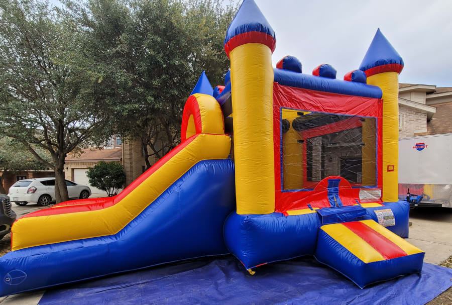 This red, blue, and yellow bouncehouse combo with slide attached is perfect for any party or just for fun occasions. It's neutral and versatile colors make it easy to match any party theme!