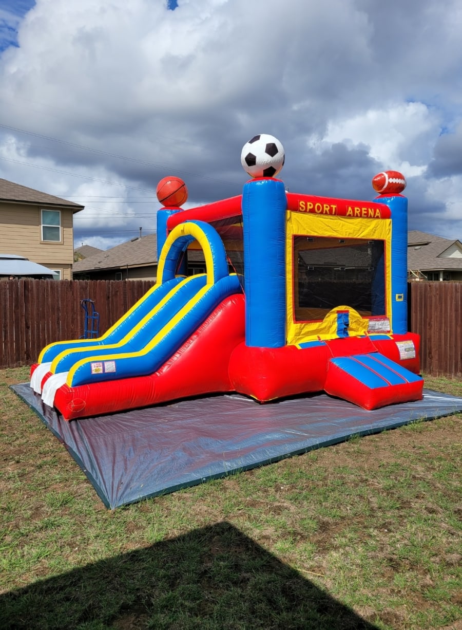 Hit a home run and Rent this Awesome Sports theme to make any birthday party extra special or book this bouncehouse combo just for FUN or school and sports themed events. This bright blue, yellow, red and white multicolored bouncehouse and double lane slide combo that has a basketball, soccer ball, tennis ball and football on top will definitely bring the life to any party.