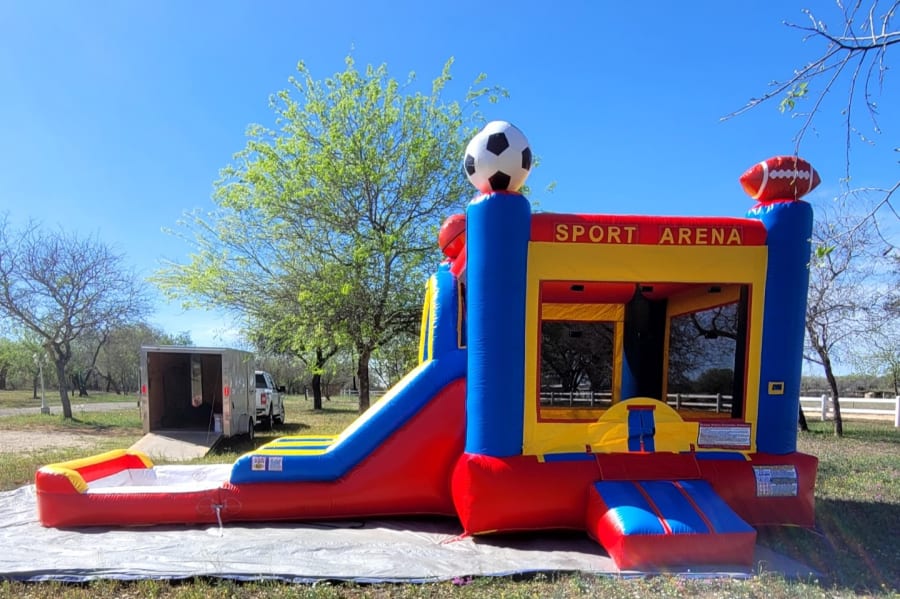 This doublelane waterslide bouncehouse combo has a big pool, two slide lanes, and a bouncy house. The slides offer two individual lanes that can be used wet or dry, just fill the pool up with water and let the summer water fun begin. This double lane bouncehouse is sports theme and will be perfect for any event that is sport related such as basketball, soccer, tennis, and baseball. The ALL STAR has blue, red, yellow and white bright colors that will surely grab attention at any event. What a great to addition to add to your party for the perfect little all star athlete.