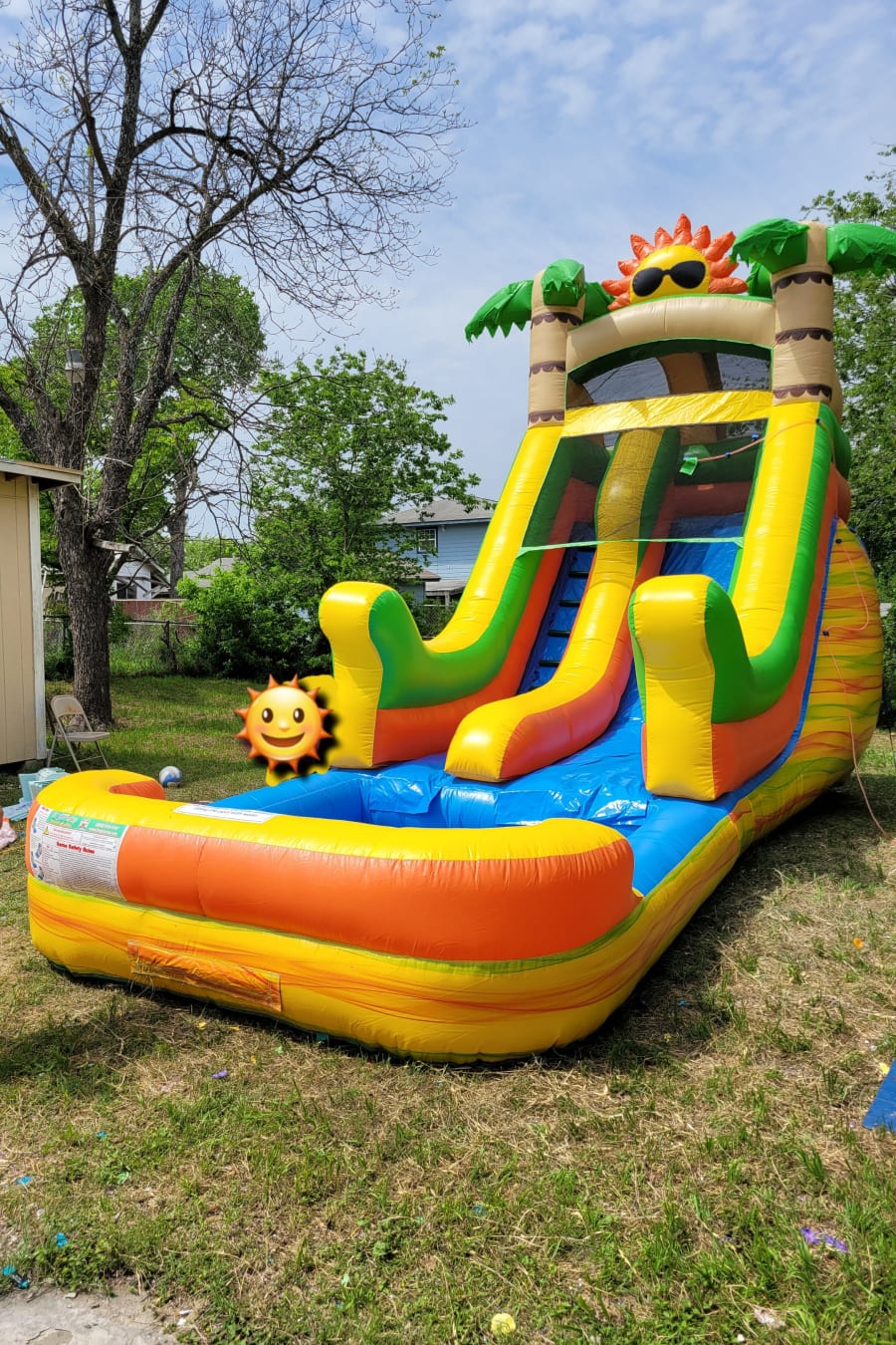 This Sunny Sunny waterslide is perfect for the younger age group. It has a big pool attached for waterslide to splash around in and a sprinkler on the top of the slide to keep the slide wet and make for more fun.Fill up the pool and let the fun begin! This waterslide has bright yellow, green colors that pop and make for a perfect summer hit for any birthday or just for fun occasion.!